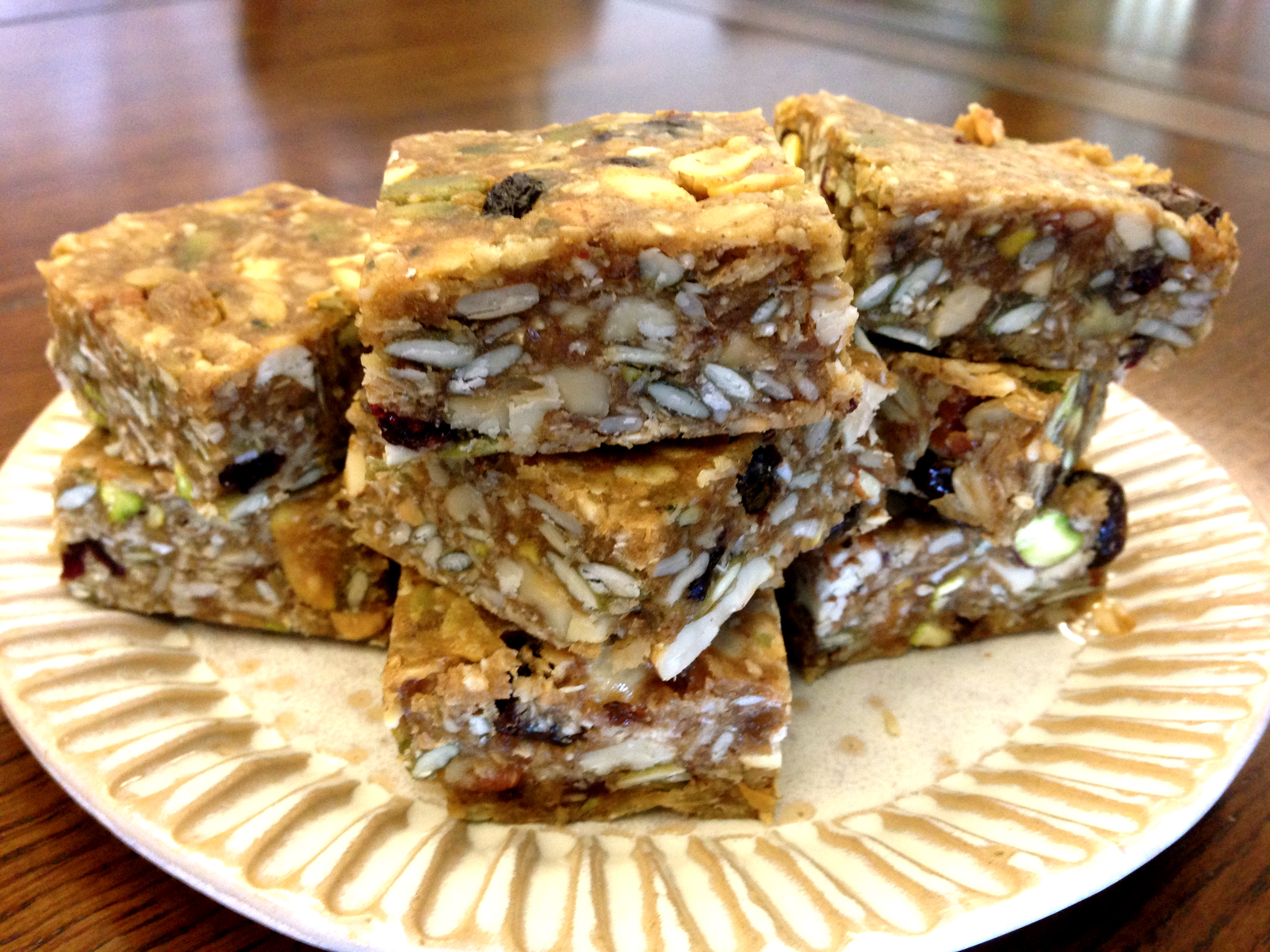 Just a tip, when cutting the granola bars, loosen around the edges first and flip upside down on a cutting board. You may have to give it a shake, but the whole slab should drop onto the cutting board. This makes it much easier to cut into squares, rectangles, triangles, whatever shape you like.